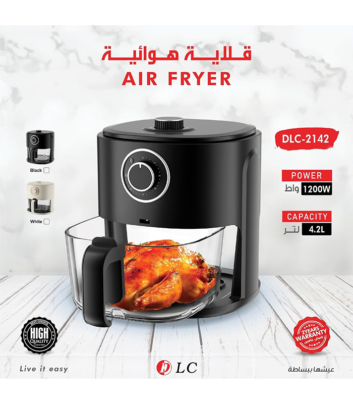 Upgrade your kitchen with the DLC DLC-2142 Visible Glass Air Fryer, designed for healthier, faster, and more convenient cooking. With 1200W of heating power and a large 4.2L capacity, this air fryer can handle family-sized meals with ease, from crispy French fries to golden chicken wings and seafood.Its adjustable temperature control and built-in timer give you full control over your cooking, ensuring even heat distribution and consistent results. The innovative transparent glass bowl eliminates the guesswork, letting you watch your food as it cooks without opening the fryer.Crafted with both style and practicality in mind, the DLC-2142 comes in a modern multicolor finish to suit any kitchen décor. The removable non-stick basket and dishwasher-safe parts make cleanup effortless, saving you time after every meal. Whether for everyday use or special occasions, this air fryer helps you prepare tasty, crispy, and healthier dishes the whole family will love.