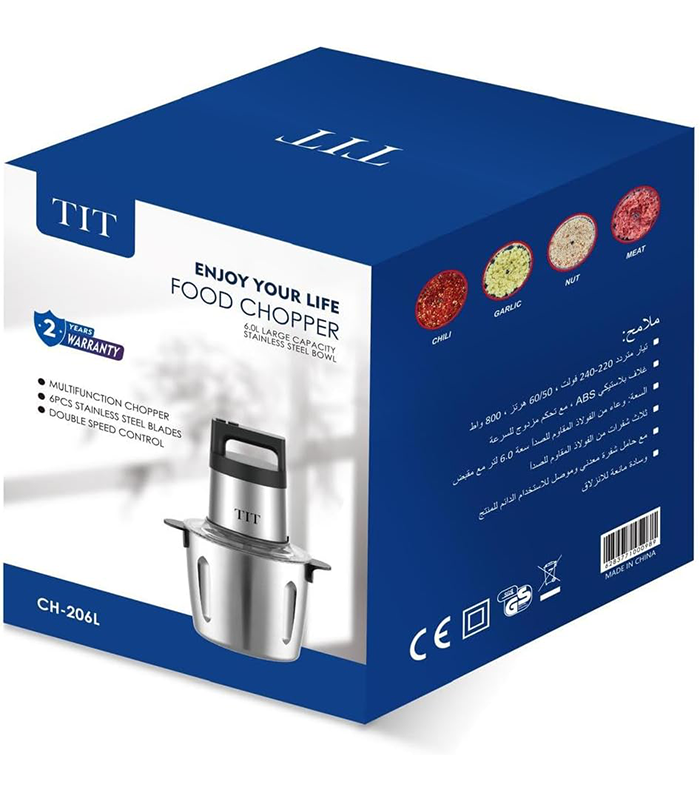 The TIT CH-206L Food Chopper features a 6-liter stainless steel bowl and 6 sharp stainless steel blades powered by an 800W motor. It efficiently chops, minces, and blends ingredients from vegetables and meat to nuts. The dual-speed control lets you achieve fine or coarse textures with ease. Its durable, easy-to-clean bowl and built-in safety features make this chopper a must-have for effortless meal preparation.