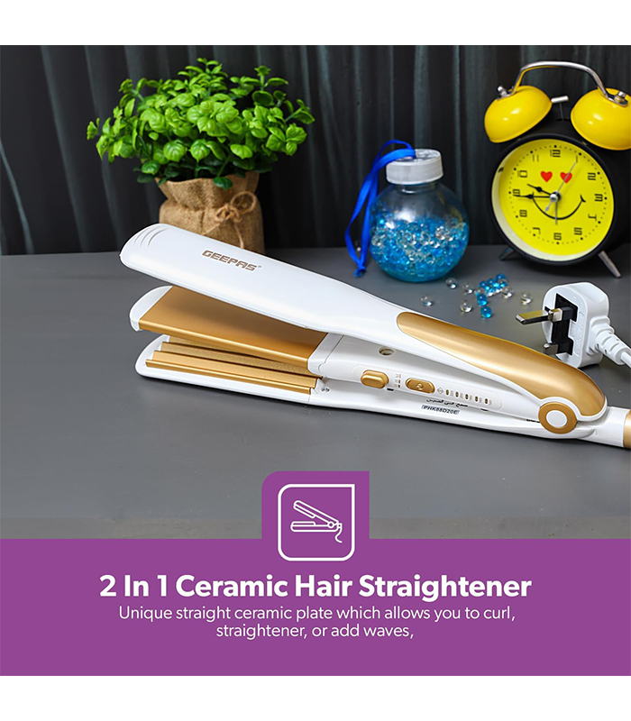 جيپاس GH8688 جهاز فرد وتجعيد الشعر 2 في 1، صفائح سيراميك عائمة، وظيفة الموجة الأيونية، تحكم بدرجة الحرارة، سلك دوار 360° – ضمان سنتين