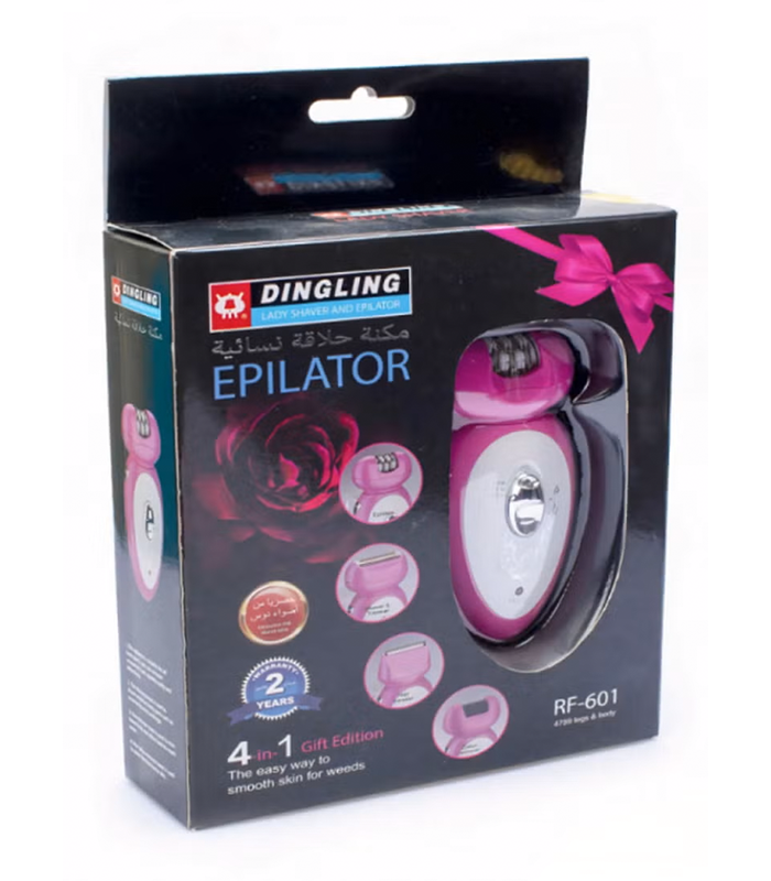 تعد ماكينة Dingling RF-601 للنساء 4 في 1 الحل المثالي للعناية المنزلية وإزالة الشعر. صممت لتمنحك بشرة ناعمة وخالية من العيوب، وتشمل ملحقات للحلاقة، تشذيب الشعر، الإزالة بالشمع، ومزيل الجلد الجاف. الجهاز لطيف بما يكفي للاستخدام على المناطق الحساسة مثل الساقين، الذراعين، تحت الإبط، وخط البكيني.يضمن التصميم المريح والخفيف الوزن سهولة التحكم والراحة أثناء الاستخدام. تساعدك RF-601 على تحقيق نتائج بمستوى صالونات التجميل دون الحاجة لمغادرة المنزل، موفرة الوقت والمال. مع أداء فعال وآمن، تعتبر مجموعة العناية للنساء مثالية للصيانة الدورية، لتمنحك الثقة وبشرة ناعمة وخالية من الشعر يوميًا.سواء للاستخدام اليومي أو المناسبات الخاصة، توفر Dingling RF-601 المرونة والراحة والأداء العالي في جهاز واحد مدمج. استمتعي بمزايا العناية بالجمال في المنزل مع هذا الحل المتكامل لإزالة الشعر.